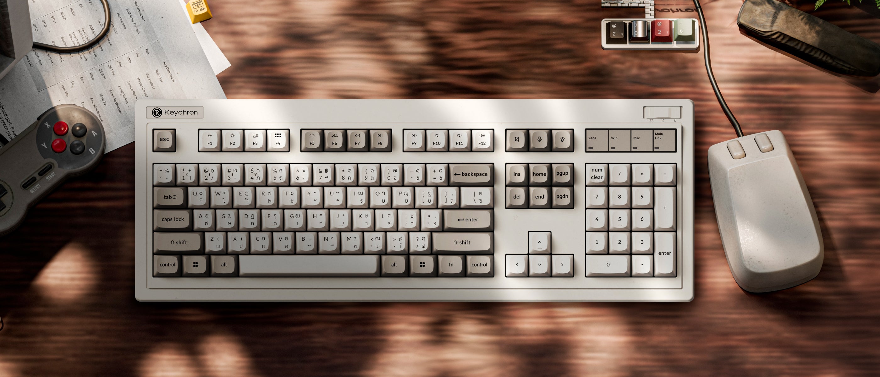 R Retro Series ดีไซน์ Retro แรงบันดาลใจจาก IBM Model M พร้อม Tri-Mode (2.4GHz / Bluetooth / USB-C) สลับใช้งานได้สูงสุด 5 อุปกรณ์โครงสร้าง Gasket Mount ให้ฟีลพิมพ์แน่น เสียง Thocky ปรับแต่งปุ่ม/มาโครผ่าน Keychron Launcher ออนไลน์ไม่ต้องติดตั้ง รองรับสลับ Windows/Mac และ Hot-Swappable เปลี่ยนสวิตช์ได้ทันที