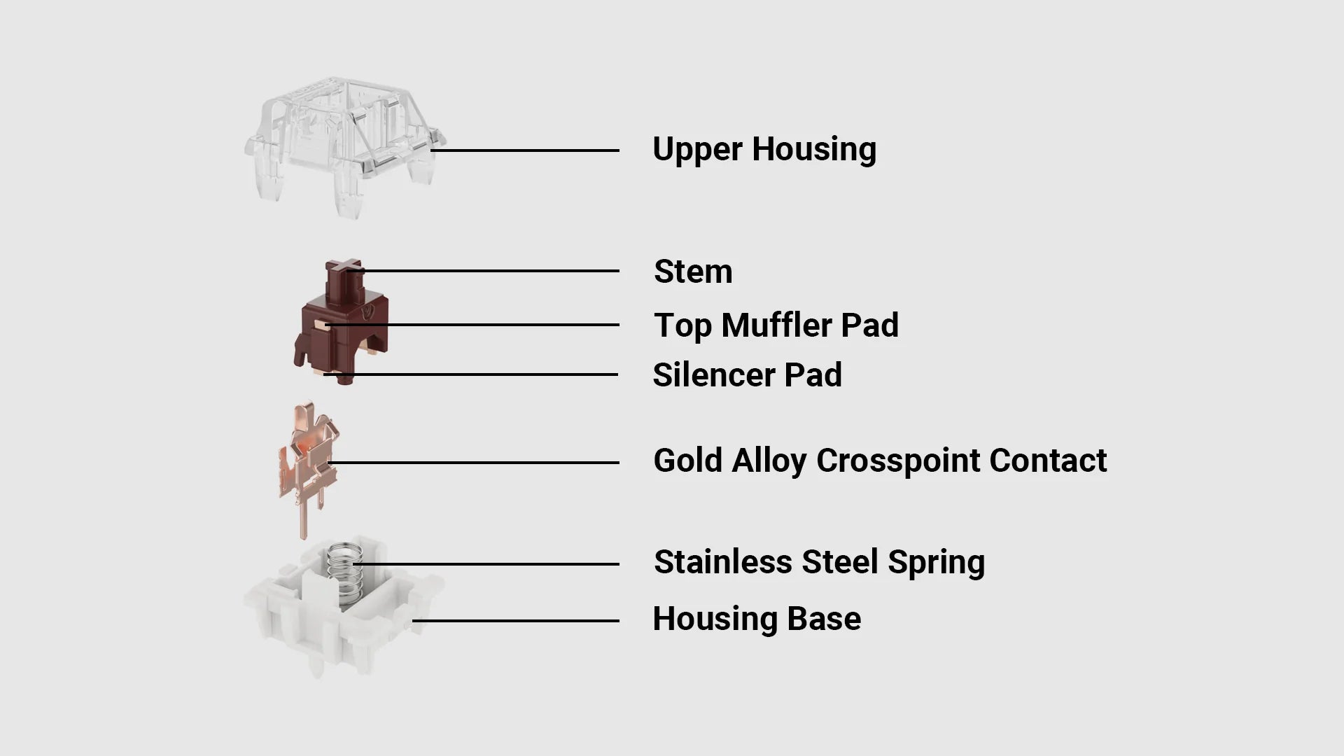 มีให้เลือกทั้งแบบสัมผัส (Tactile) และ (Linear) สำหรับสี มีให้เลือก ได้แก่ สีดำ แดง น้ำตาล ขาว และเหลือง
